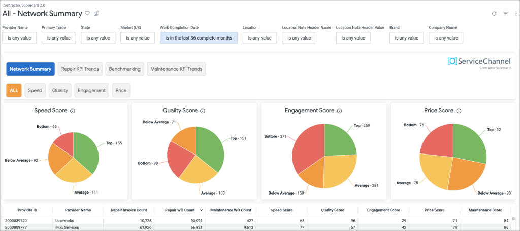 Your Network Summary page, the starting point in your scorecard, provides these high-level scores for all providers in your network. From there, you can refine and deepen your insights by filtering for a specific provider, priority, trade, geographic area, date range, location, brand/company name, or industry. You can compare providers across your network or against the entire ServiceChannel platform to pinpoint where your network excels — and where improvements are needed.