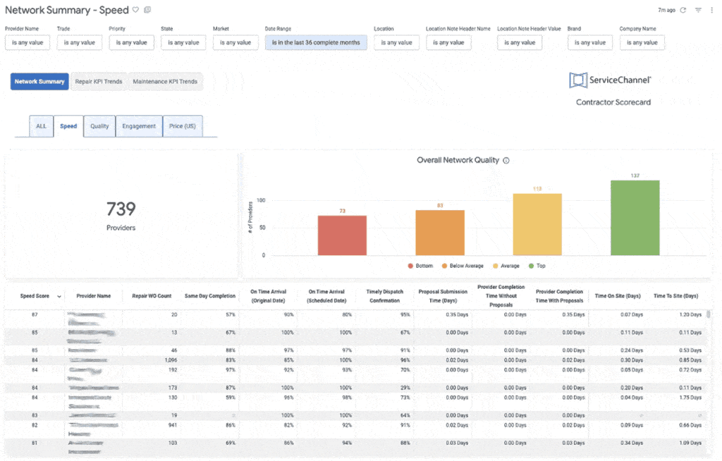 - From the Speed, Quality, Engagement, and Price tabs, you can see a breakdown of how your network compares to all the providers on ServiceChannel for that score. Click on the chart to see the providers in that tier.