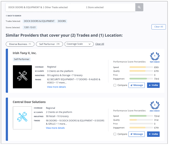 To help you choose the best provider available for your needs, you’ll now see each provider’s strengths in Provider Search results. Badges include Cost-Effectiveness, Top Quality, Top Speed, and Top Engagement for providers performing in the top 25% for the selected trade. Highlights include Trade Match, Industry Match, New Local Provider, Office Nearby, Self-Performer, Diverse Business, and Highly Responsive (fast to accept invitations).