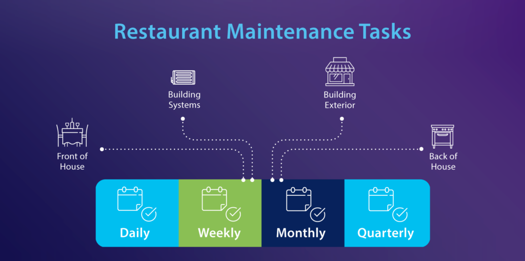Planned facilities maintenance generally covers these tasks daily, weekly, monthly, quarterly, and annually. When developing your restaurant’s preventive maintenance strategy, consider these areas: