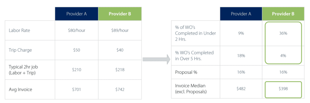 Labor time and other expenses are what really drive the total cost of service. In the example below, Provider A has the lower hourly rate but Provider B typically completes work faster. This means, the median invoice for Provider B is actually lower than Provider A. Note that excluding proposals creates the best apples-to-apples comparison.