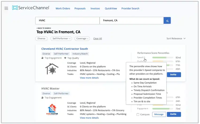 The provider’s profile on Provider Search gives you insights through an abundance of valuable information, including service coverage area (both stated and actual), specific trades and specialties, work order history and volume, detailed performance history on ServiceChannel, and verified business information.