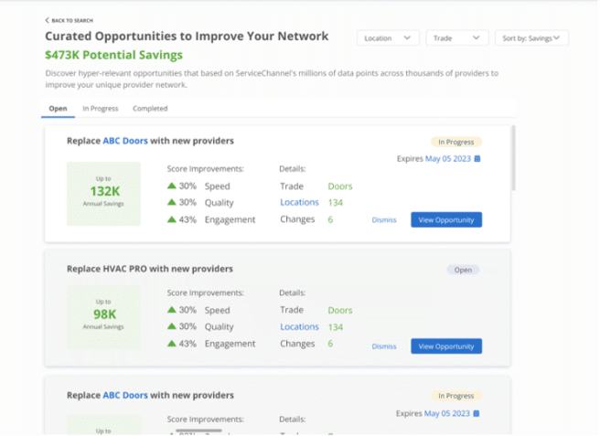 Use Provider Search* to easily browse your network categories and compare your providers against thousands of similar pros nationwide based on their actual performance from over 180 million work orders. Your top Network Opportunities will be shown there as well.